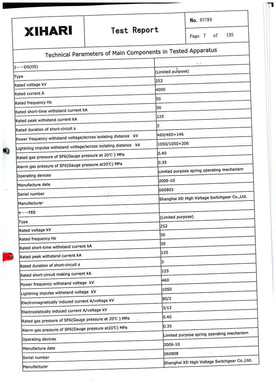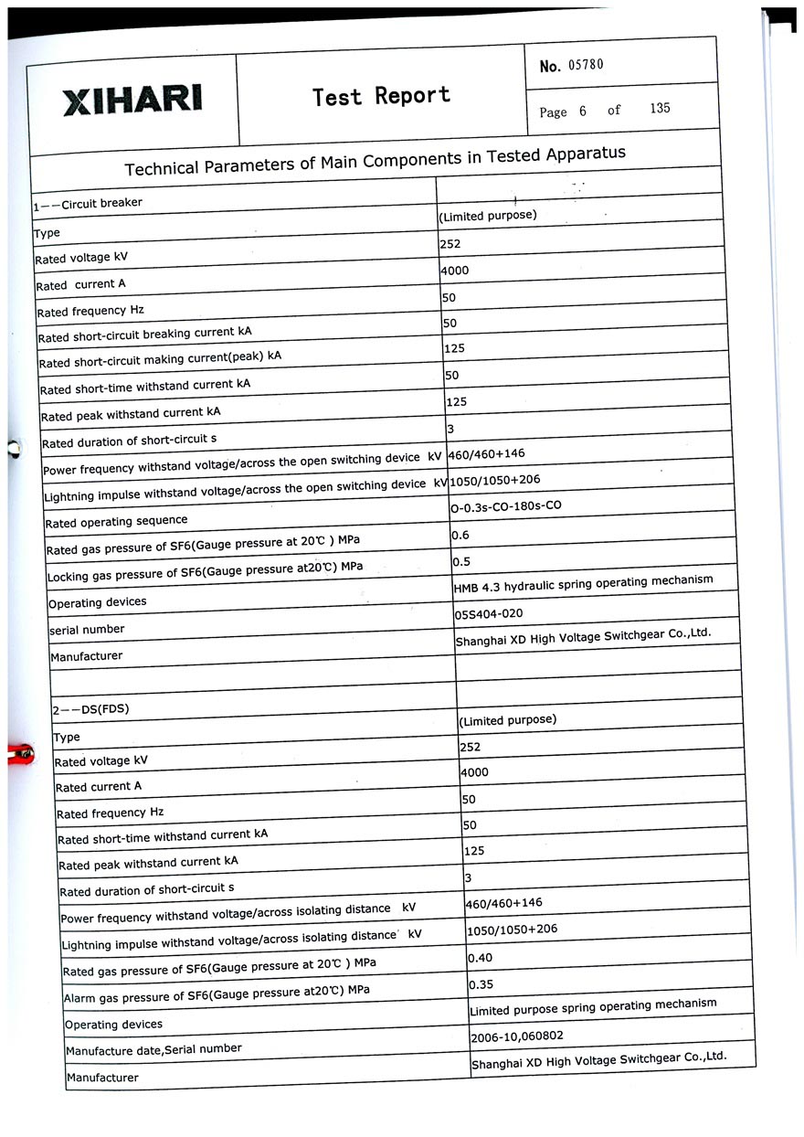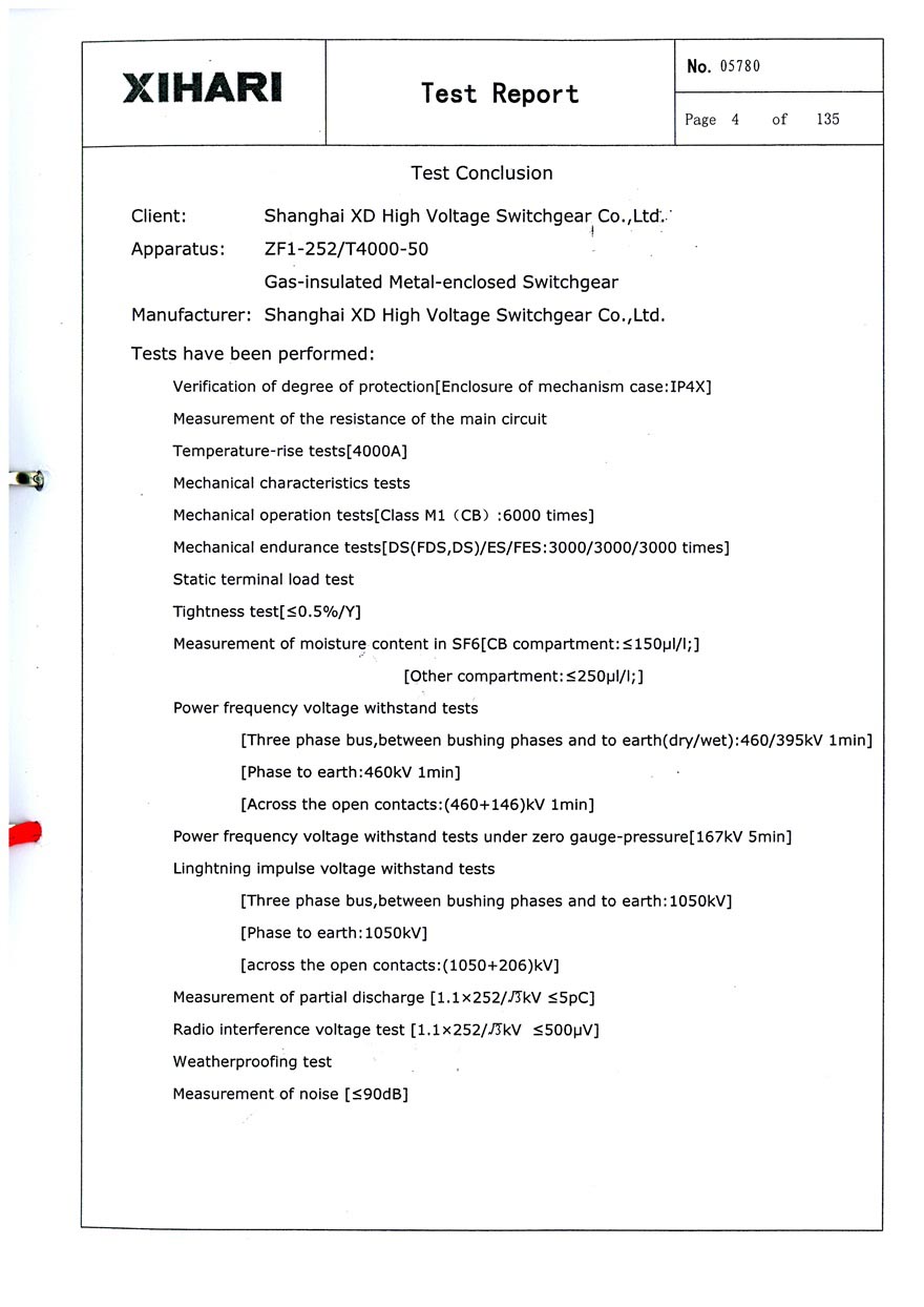 ZF1-252 T4000-50 GAS-INSULATED METAL-ENCLOSED SWITCHGEAR TEST REPORT